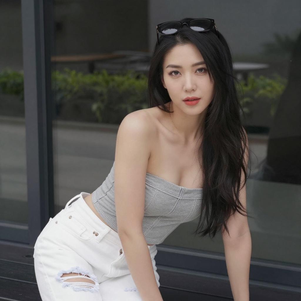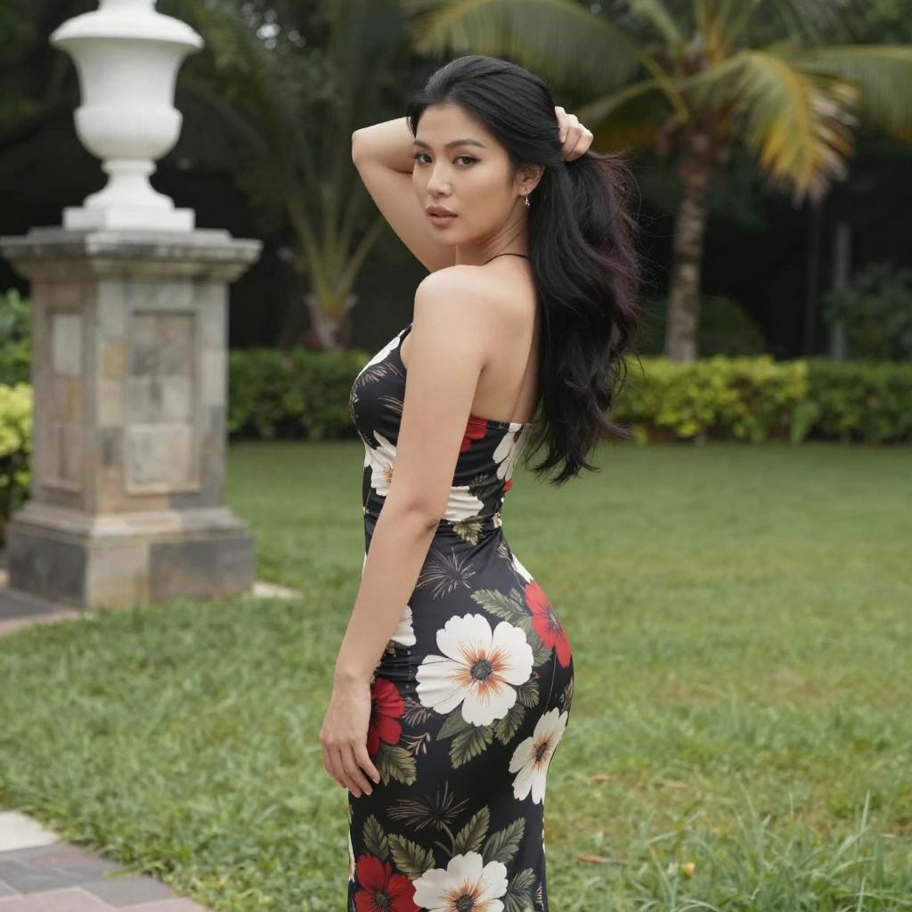 Photograph of an Asian woman with long black hair, wearing a tight, strapless, beige mini dress, standing outdoors by a metal fence. She holds a brown leather handbag and looks over her shoulder. Background includes green trees, blue sky, and grassy field.