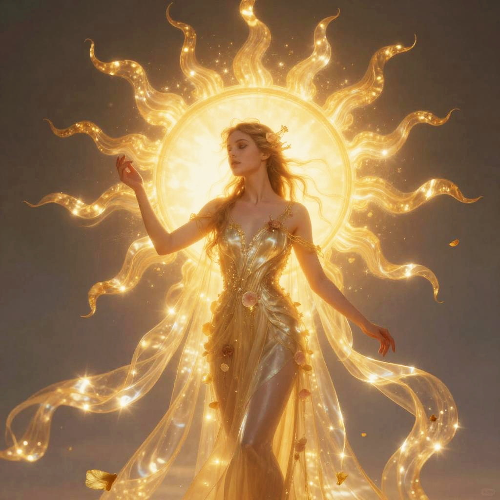 An ethereal depiction of a radiant sun nymph, bathed in golden dawn light, with radiant petals and luminous silk, art inspired by Elena Gordon.