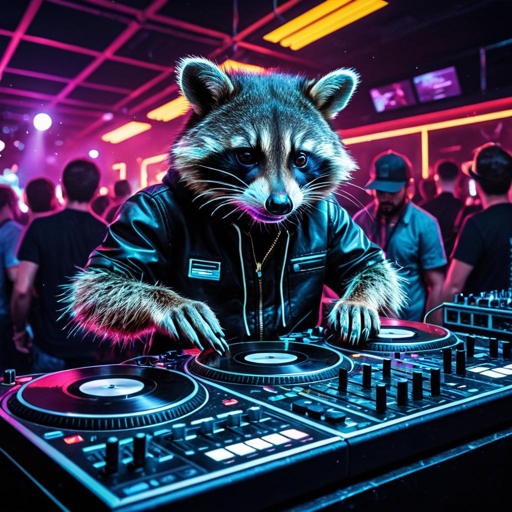 Digital art of a raccoon DJ mixing music at a nightclub, futuristic, highly detailed, vibrant colors