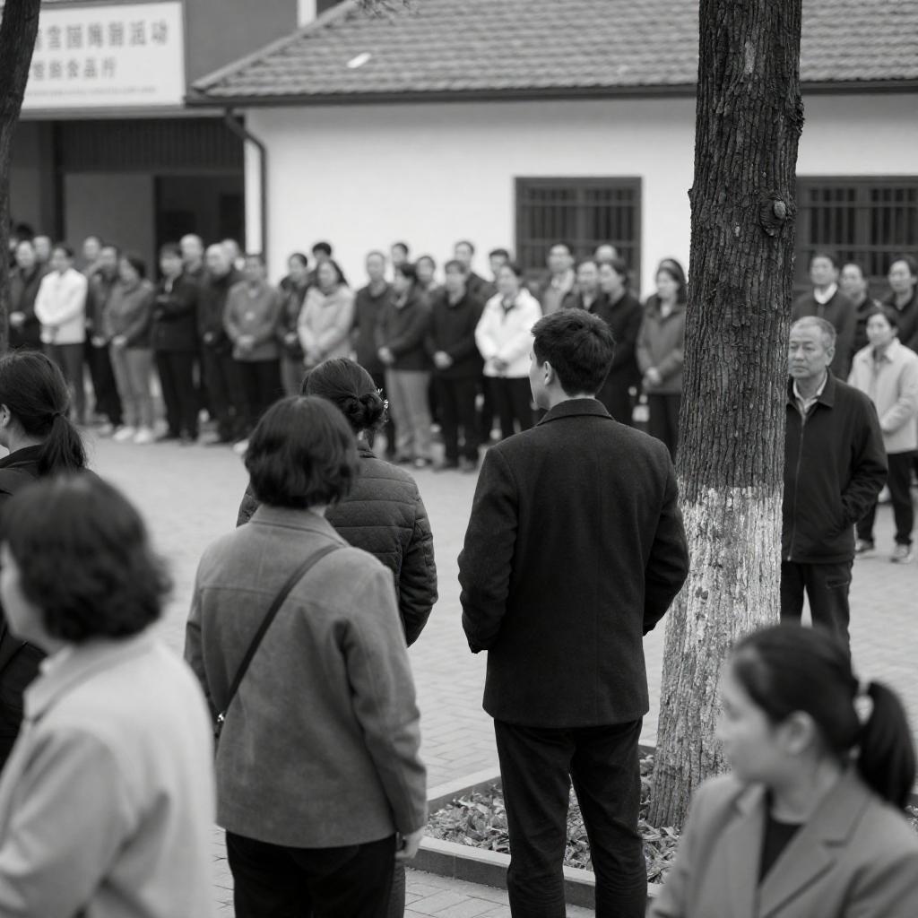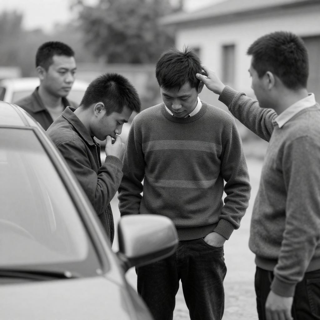 Black-and-white photograph of four men near an open car door. One man in a striped sweater stands center, looking down, while another in a jacket leans forward, head in hand. A third man, in a sweater, touches the central man's head. Background shows a blurred outdoor setting.