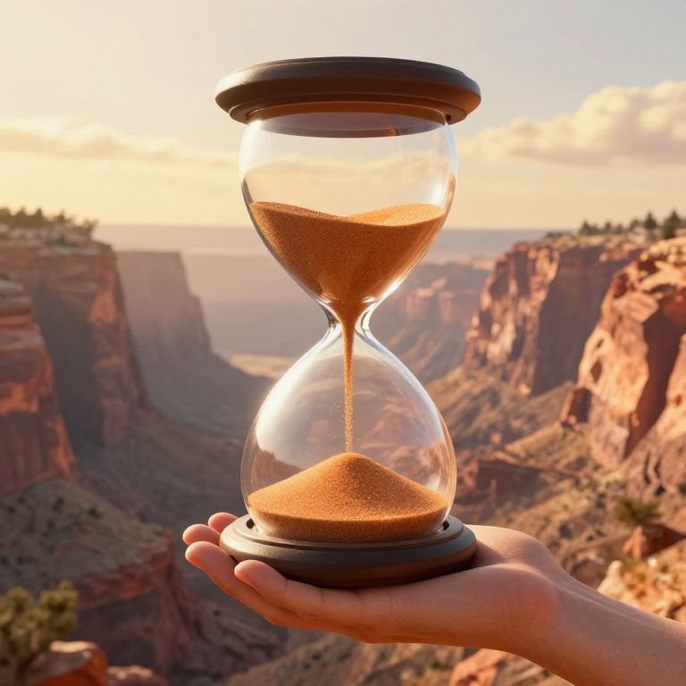 A photograph of a clear glass hourglass with brown sand, held in a light-skinned hand, against a backdrop of a sunlit, rugged desert canyon landscape. The hourglass features a black top and bottom rim, with sand trickling from the top to the bottom. The canyon in the background has red and orange rock formations, with a clear sky and scattered clouds. The hand is positioned in the lower right foreground, with the canyon stretching out in the background, creating a contrast between the small, focused hourglass and the expansive, natural scenery.