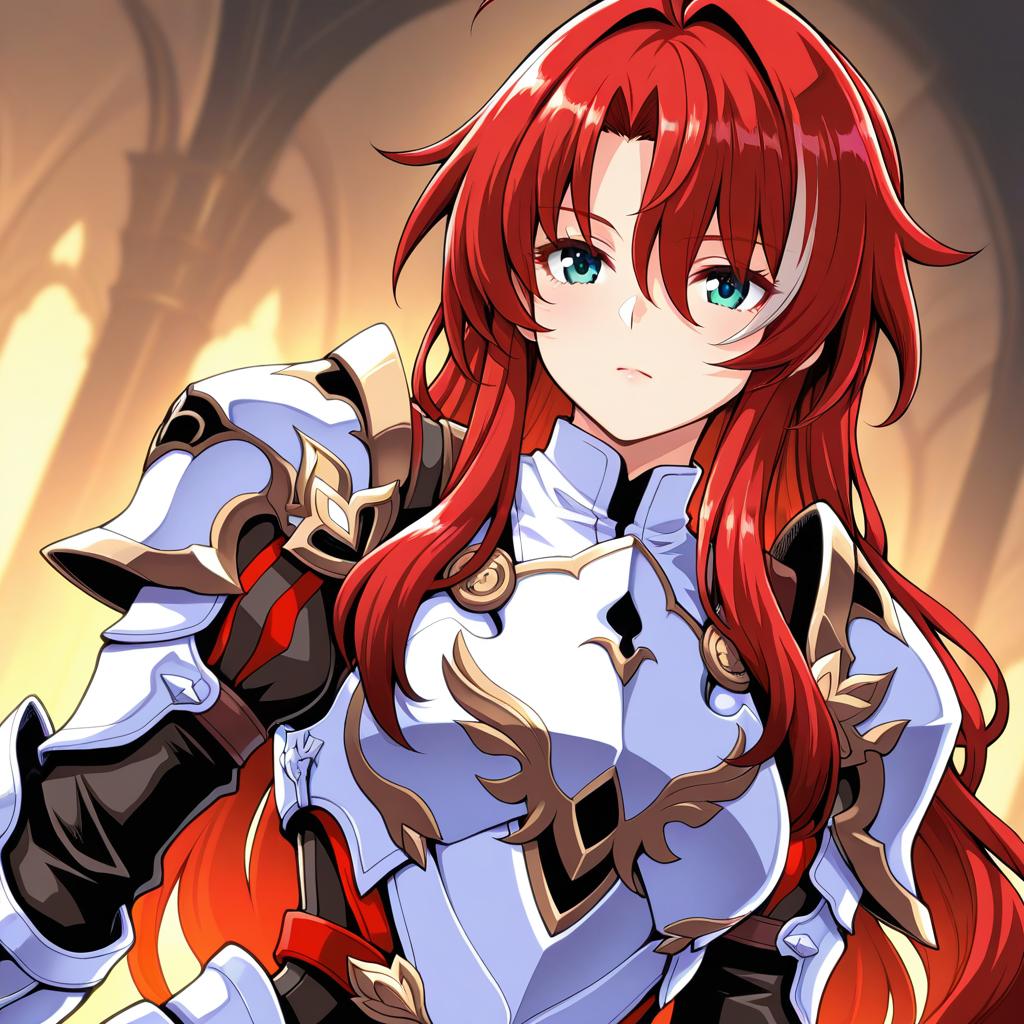 Argenti (honkai: star rail), honkai: star rail, 1boy, green eyes, hair between eyes, red hair, long hair, curtained hair, streaked hair, ahoge, parted bangs, white armor, knight, gauntlets, knight, pauldrons, breastplate, by artist hagiya masakage, illustrious