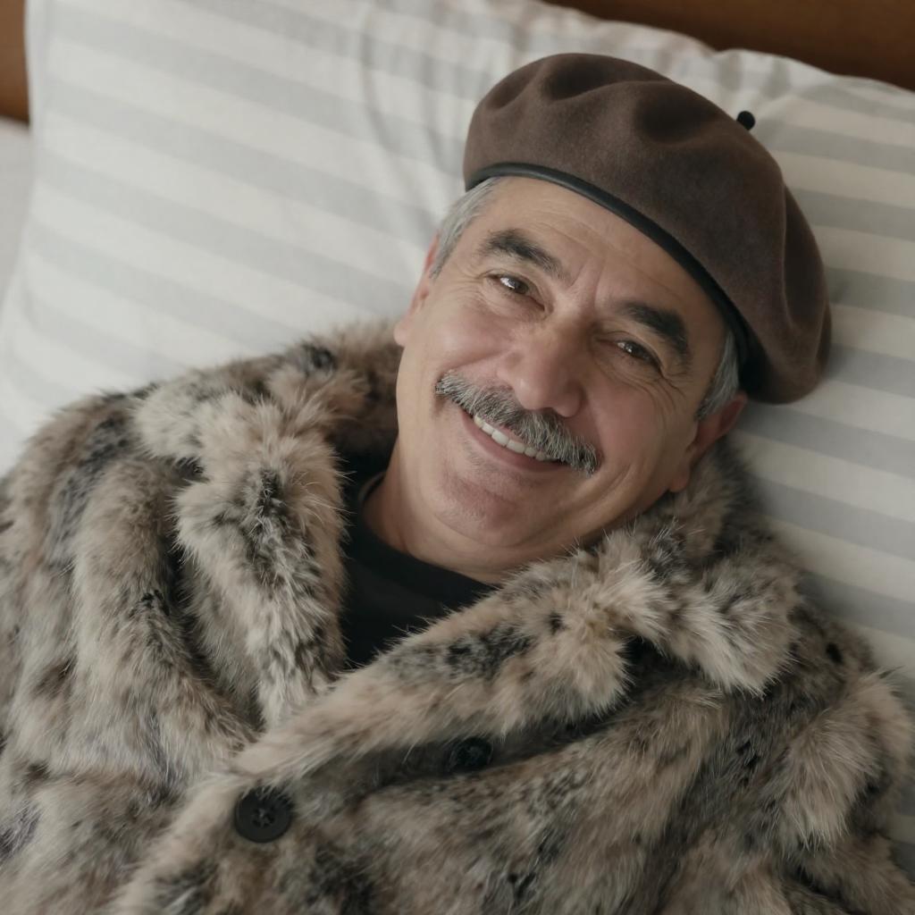 Photograph of a smiling middle-aged man with light skin, short gray hair, and a mustache, wearing a brown beret tilted to the side and a black-and-white fur coat. He lies on a striped bed, looking directly at the camera. The background is a white and light gray striped bedspread.