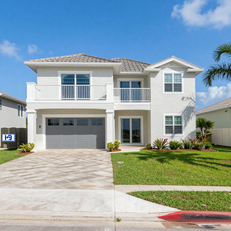 This is a bright, high-contrast photograph of a modern, two-story white house with a gray, shingled roof. The house features a large, white, double-door garage on the left and a central front door flanked by two windows. A white balcony with railings is above the garage. The house is surrounded by a well-maintained, green lawn with small plants and a palm tree on the right. The driveway is paved with light-colored tiles, and the sidewalk is bordered by a red curb. The sky is clear and blue, indicating a sunny day. The house number "18" is visible on a sign to the left.