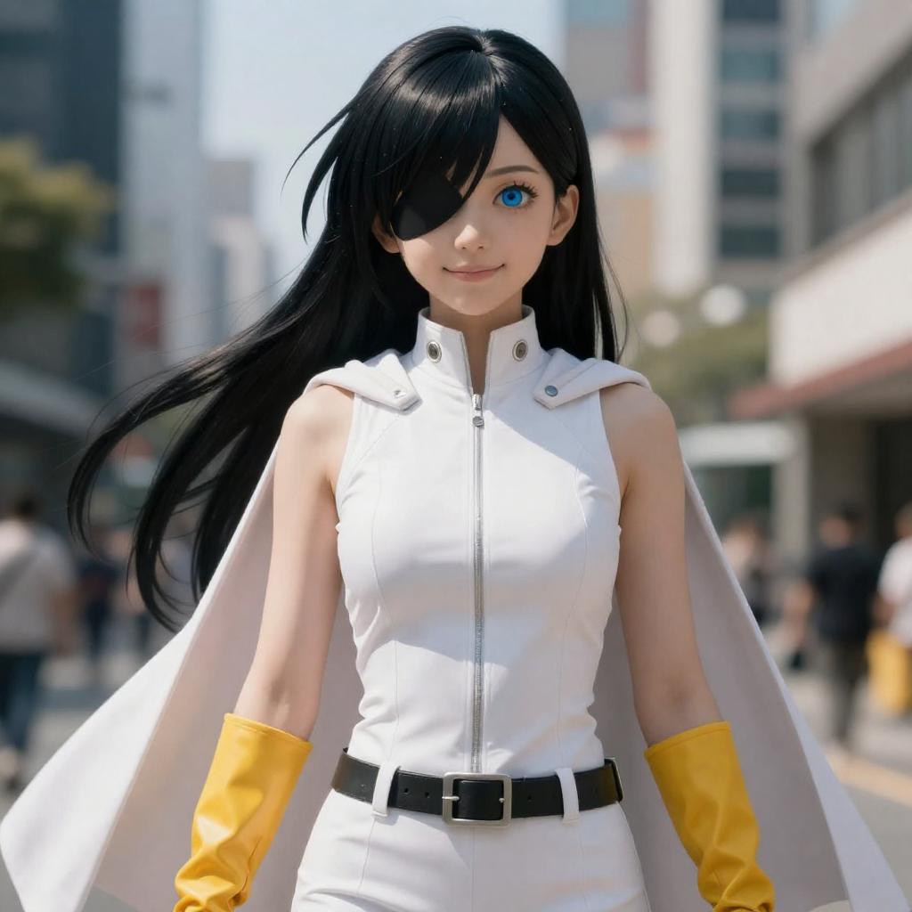 Ultra realistic 8k cg, masterpiece, ((ultra detailed background, delicate pattern, intricate detail)), (highly detailed, fine details), best quality, 1girl, (photorealistic:1.4), beautiful lighting, absurdres, RAW photo, film grain, csm anime style, makima \(chainsaw man\), yoru, long hair, red eyes, portrait, scar on face, scar on nose, ringed eyes, pinafore dress, black ribbon, (full body), crazy eyes, crazy smile