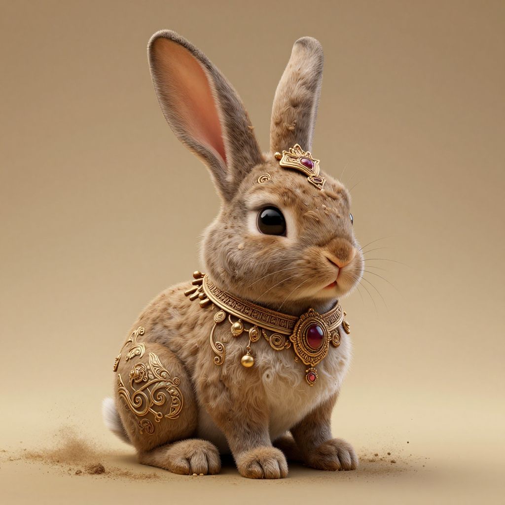 A hyper-realistic steampunk-style bunny adorned with intricate filigree armor, reminiscent of the work of special effects designer Stan Winston.