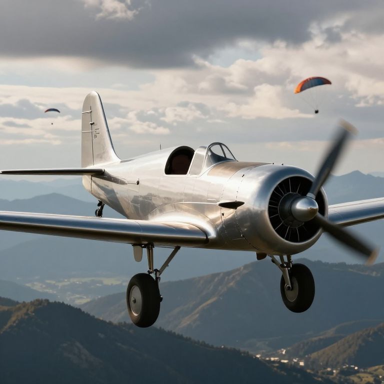 1938 classic airplane flying over mountains, sleek silver fuselage gleaming in sunlight, propeller blur showing motion, parachutes visible in the distance, dramatic cloudy sky adding intensity, capturing the spirit of early aviation adventure.