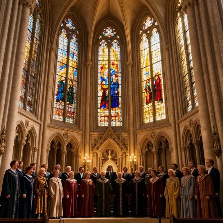 Hallelujah scene in a vast cathedral, golden light streaming through stained glass windows, choir singing passionately, rich textures and intricate architectural details, a sense of spiritual awe and reverence, vibrant colors and dynamic lighting.