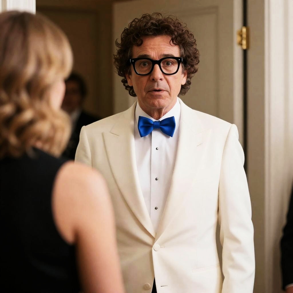 Middle-aged bald man with glasses, black tuxedo, white shirt, black bowtie, sitting at dimly lit restaurant table. Forearm resting on table, looking slightly to the side. Glass on table to left. Background includes blurred people, framed portraits on wall. Warm, golden lighting.