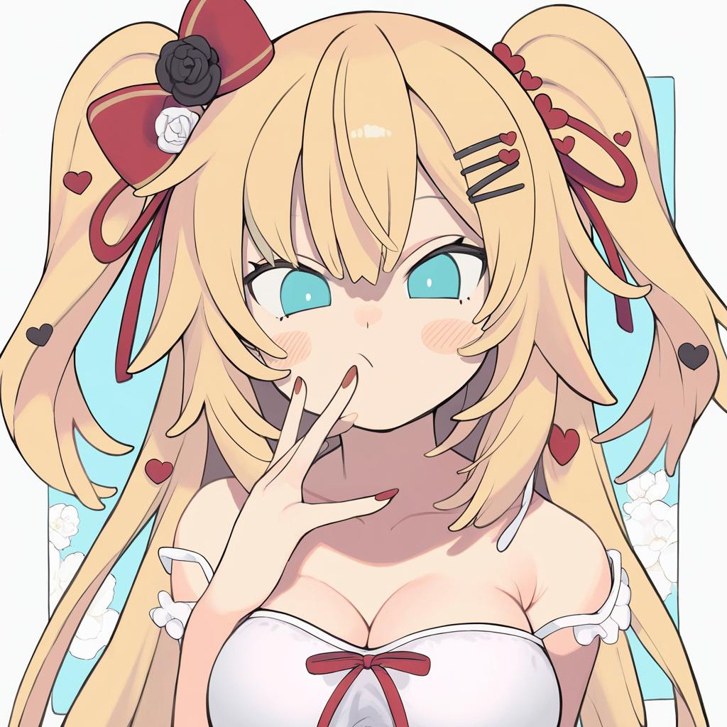 Digital illustration of a blonde-haired anime-style female character with aqua blue eyes and very long hair styled in two high side ponytails. She wears a white off-shoulder top with red ribbon accents and has heart-shaped hair ornaments and hair clips. The character has a playful or thoughtful expression with her fingers near her lips and red nail polish. The background is light with white floral elements. This character resembles the virtual YouTuber design style.