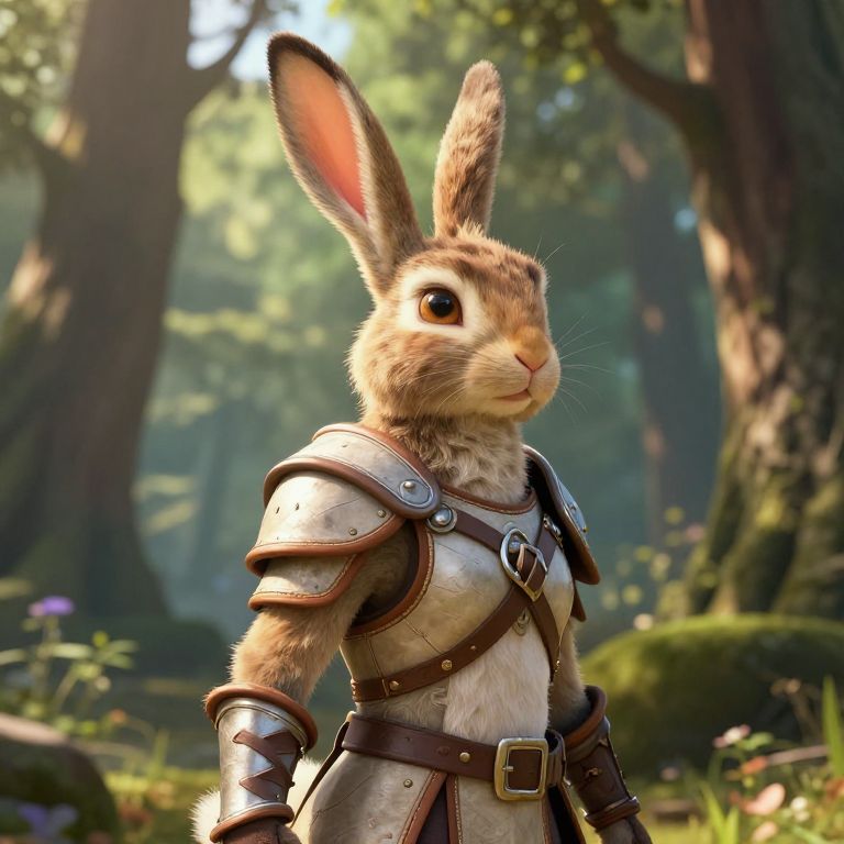 Harengon race 5e character standing in a sunlit forest, agile and alert with large rabbit ears, detailed fur textures, wearing light leather armor, fantasy RPG style