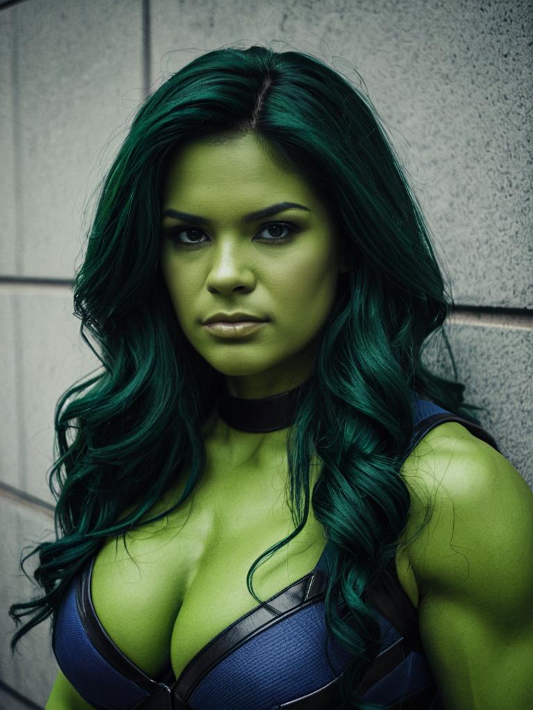 Woman in She Hulk costume, photorealistic cosplay portrait, cinematic realism