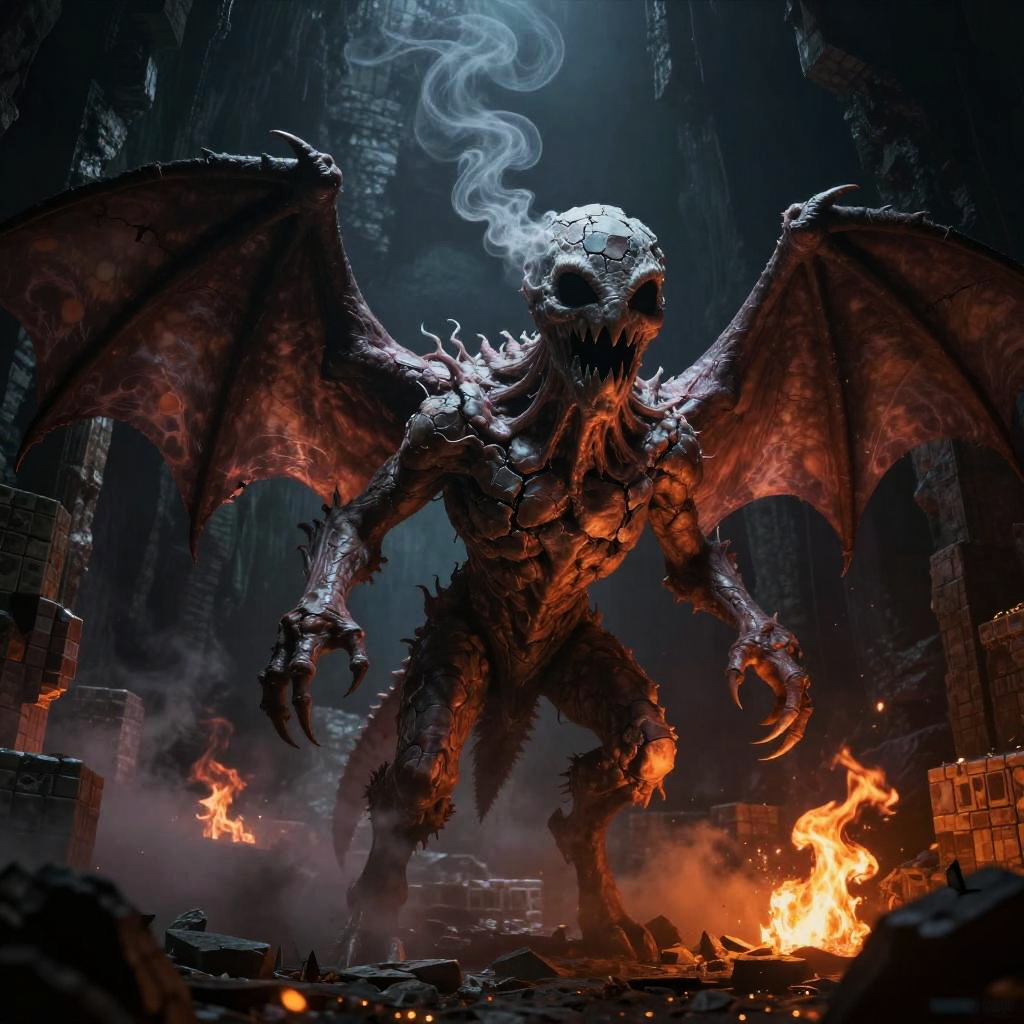 Realistic Minecraft ghast in a haunting Nether cavern, massive and ghostly with torn, square-shaped wings, emitting translucent smoke and fireballs, highly textured skin with cracked stone and flesh details, dramatic shadows and glowing embers surrounding it.