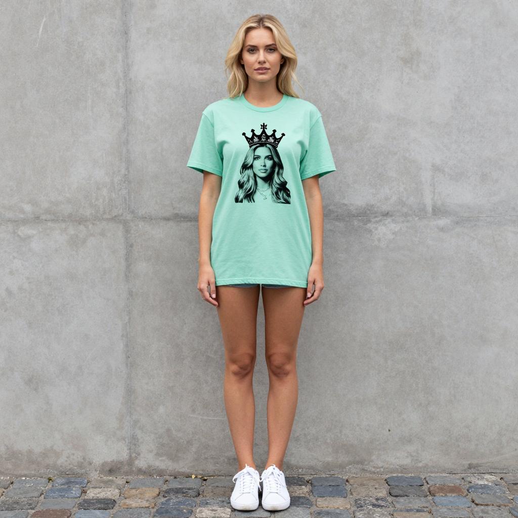 Blonde Woman Wearing Mint Green Crown Graphic T-Shirt