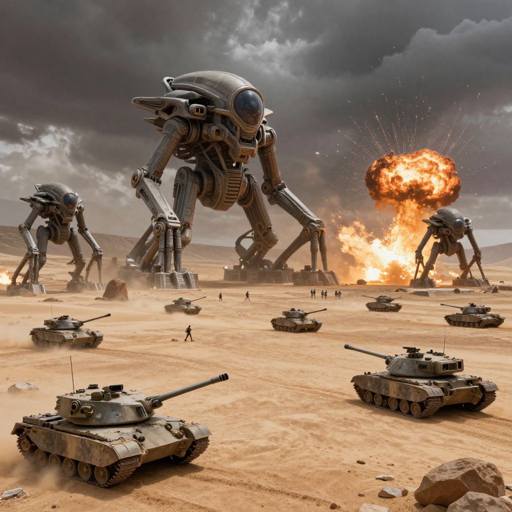 Aliens vs humans showdown in a desolate desert battlefield, towering alien war machines facing off against human tanks and infantry, dramatic clouds and explosions, sci-fi realism