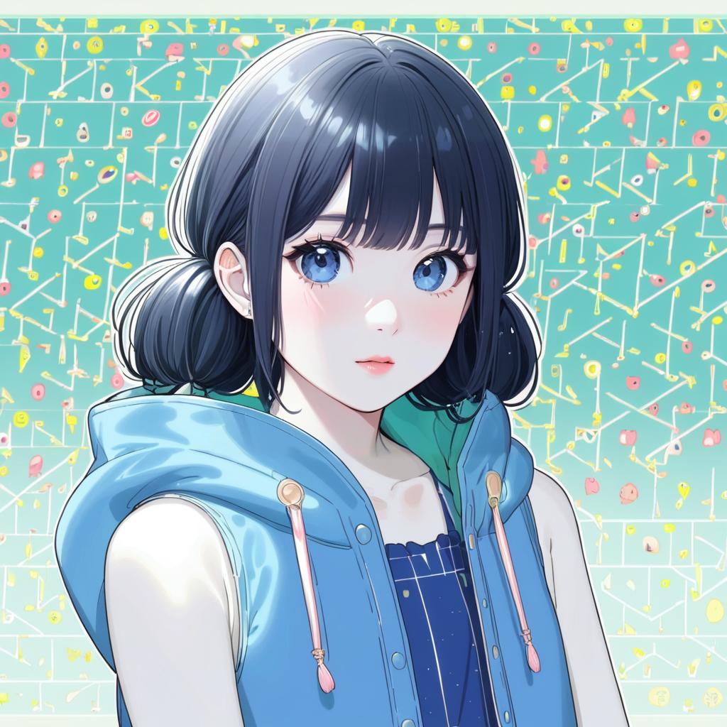 Illustration of an anime-style girl with long black hair styled in low twintails, striking blue eyes, and fair skin. She is wearing a blue sleeveless jacket over a light purple hoodie with the hood down, exposing her bare arms. The background is a patterned teal color with circles resembling stylized eyes. The artwork features clean, vibrant coloring and detailed facial expressions, capturing a serene and thoughtful mood.