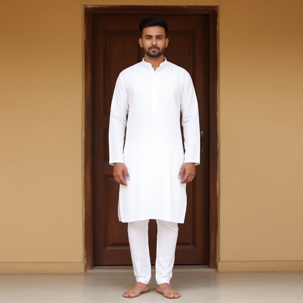 "Traditional White Kurta Pajama, a man in a white shirt and white pants standing in front of a door"