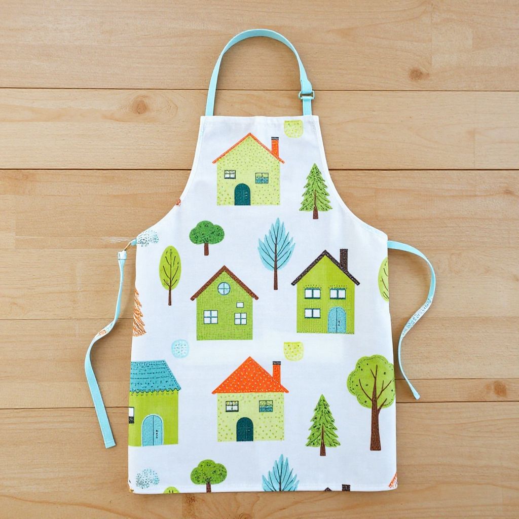 Colorful apron featuring whimsical green houses and trees, crafted by Penny Rose Fabrics, rests elegantly on a wooden surface, showcasing its playful design and vibrant details.