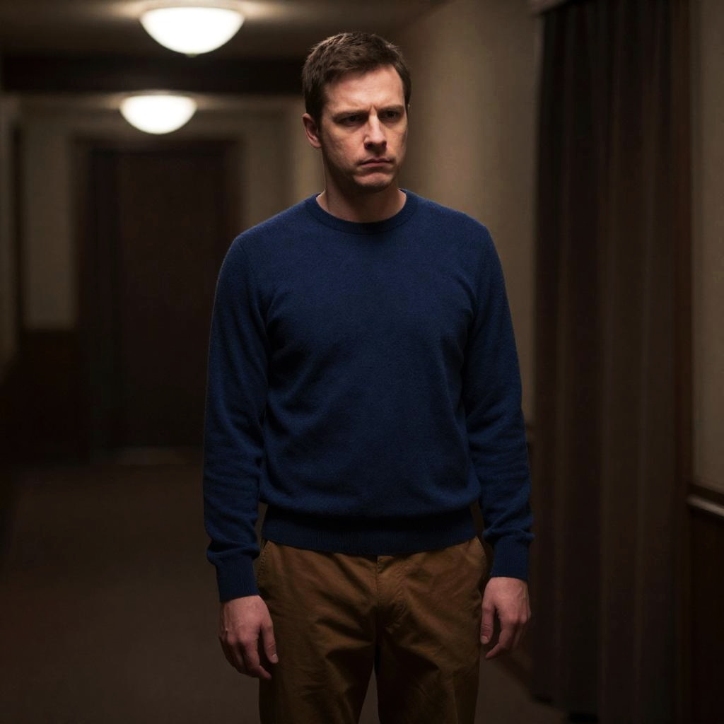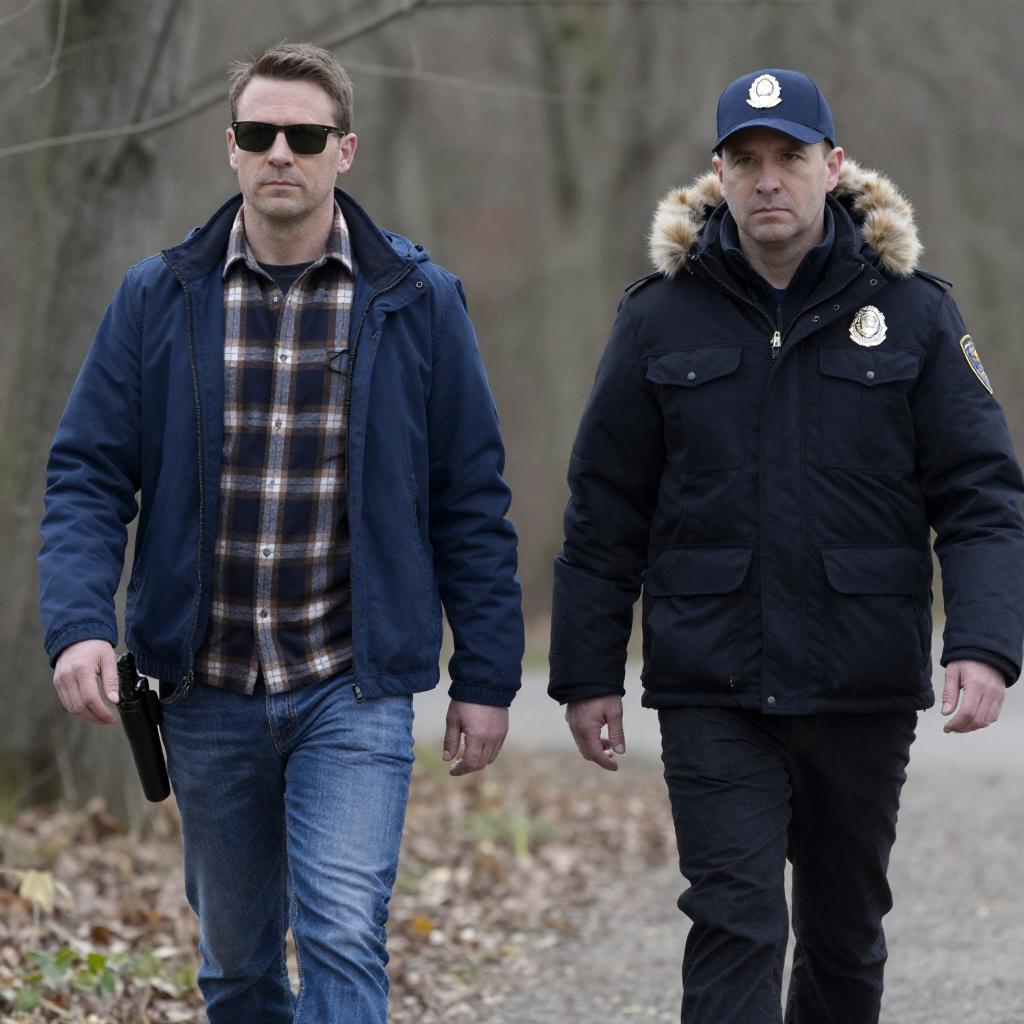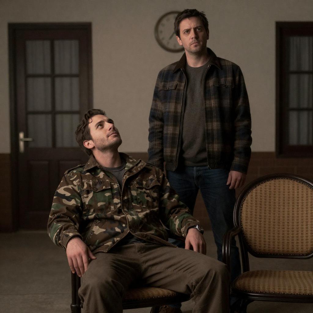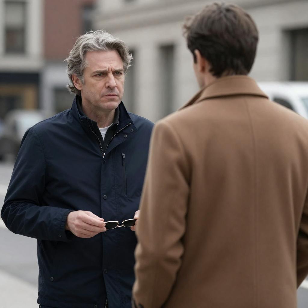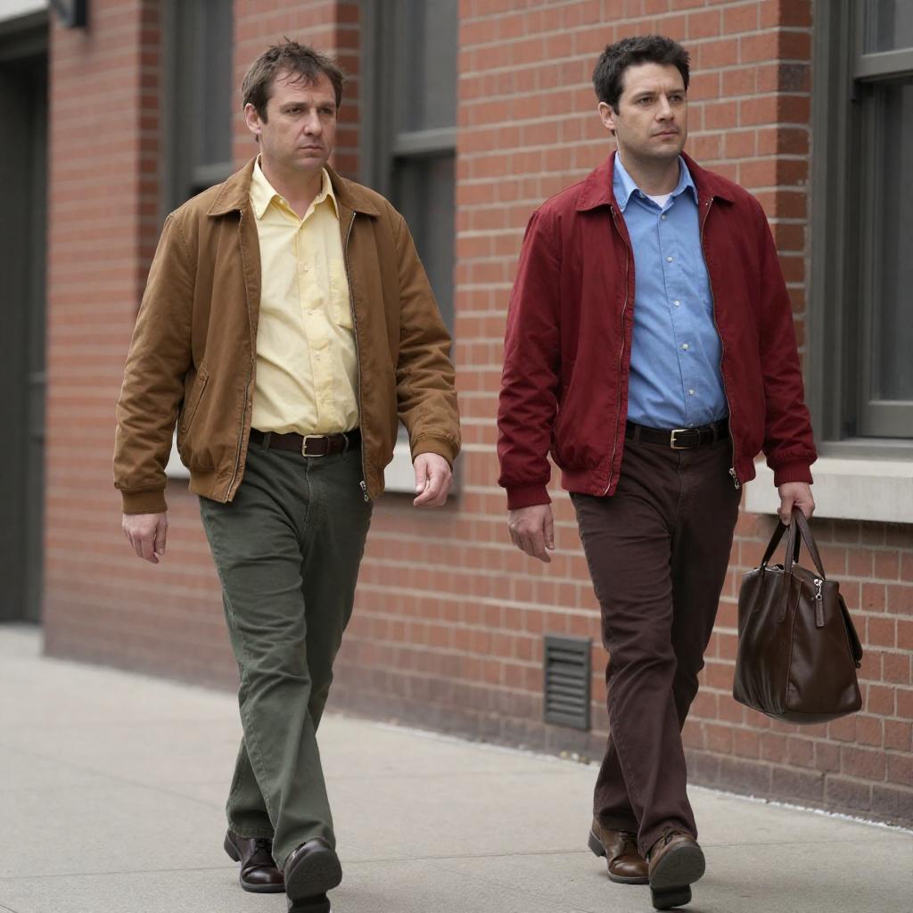 Photograph of two men walking on a sidewalk in front of a red brick building. The man on the left wears a brown jacket, yellow shirt, and green pants, with a slightly disheveled appearance. The man on the right wears a red jacket, blue shirt, and brown pants, carrying a brown bag. Both have short, dark hair and are mid-stride, looking ahead.