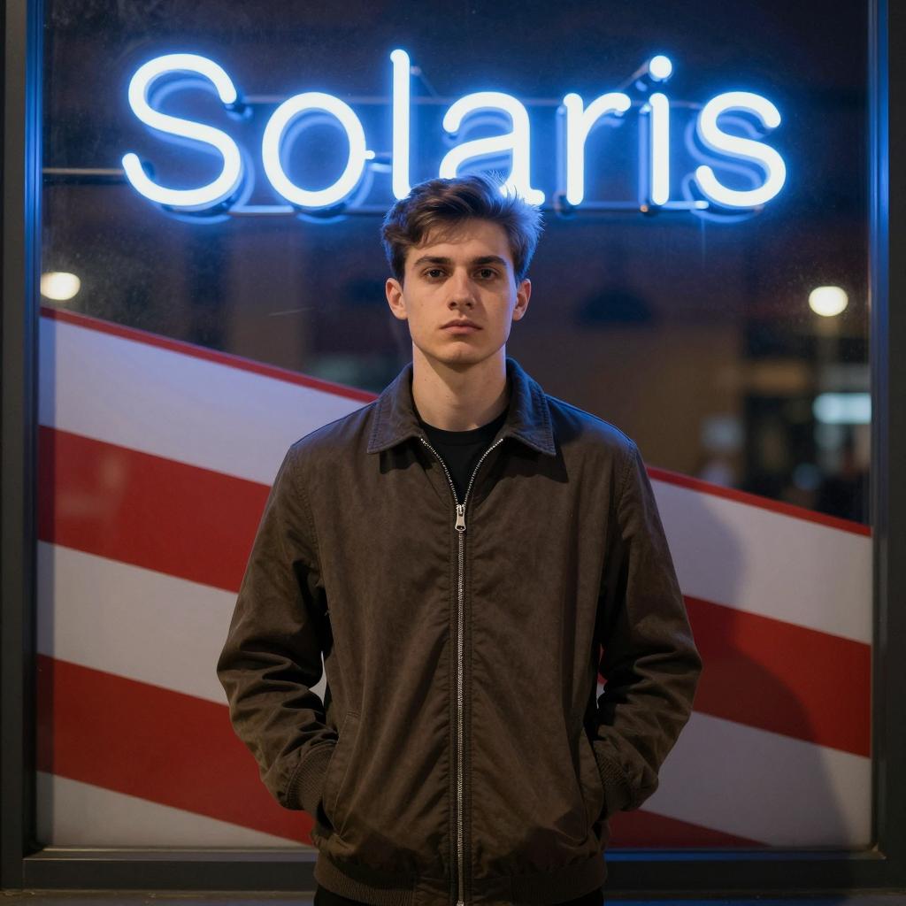 Young man with short brown hair stands in front of a brightly lit glass window with neon blue "Solaris" sign. He wears a dark brown zip-up jacket, hands in pockets, serious expression. Window has red and white striped pattern. Dimly lit interior background.