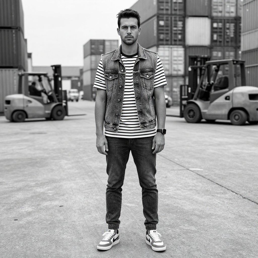 A man, acid-wash denim vest, striped crew neck, slim-fit joggers, retro skate shoes, monochrome scheme, sprawling concrete expanse, towering shipping containers, bustling forklifts in motion, 3M analog film stock, confident expression. Man has masculine face and piercing eyes