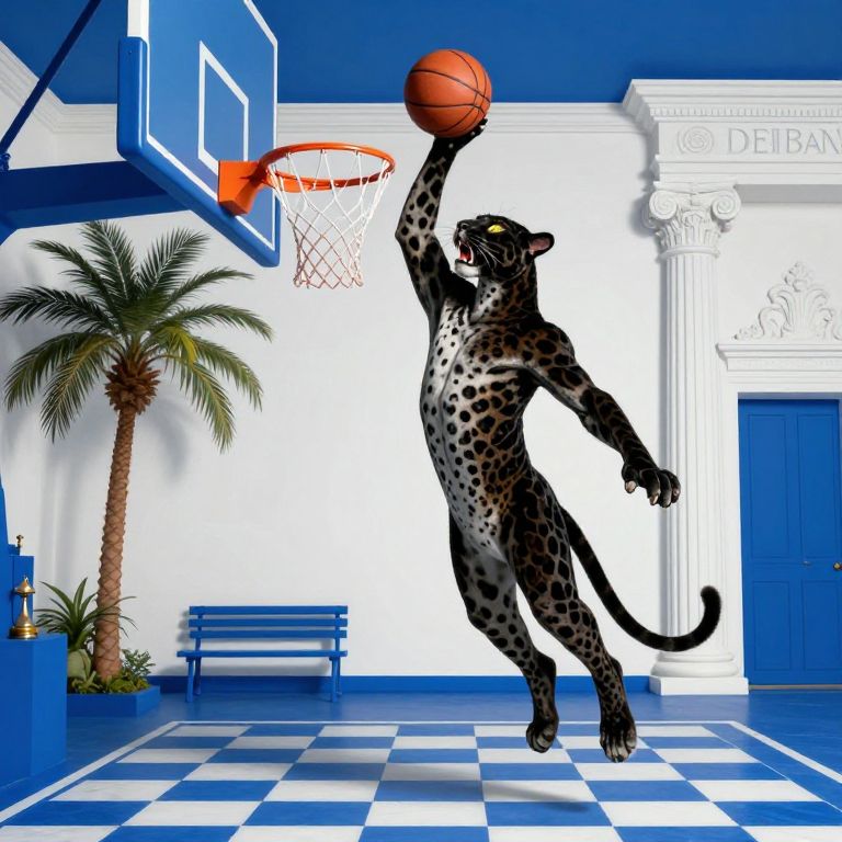 Digital illustration of a black leopard playing basketball in a brightly lit, blue-and-white gym with a palm tree and classical columns. The leopard leaps, shooting