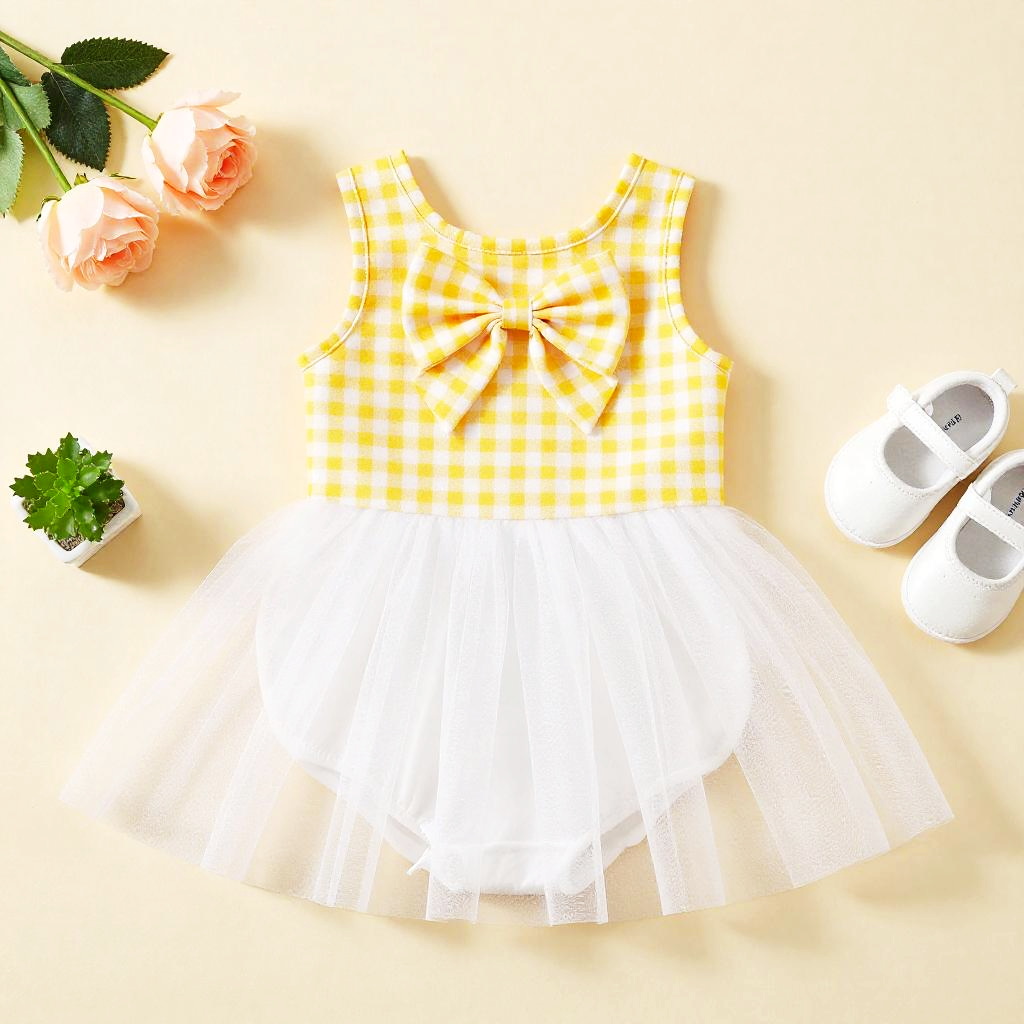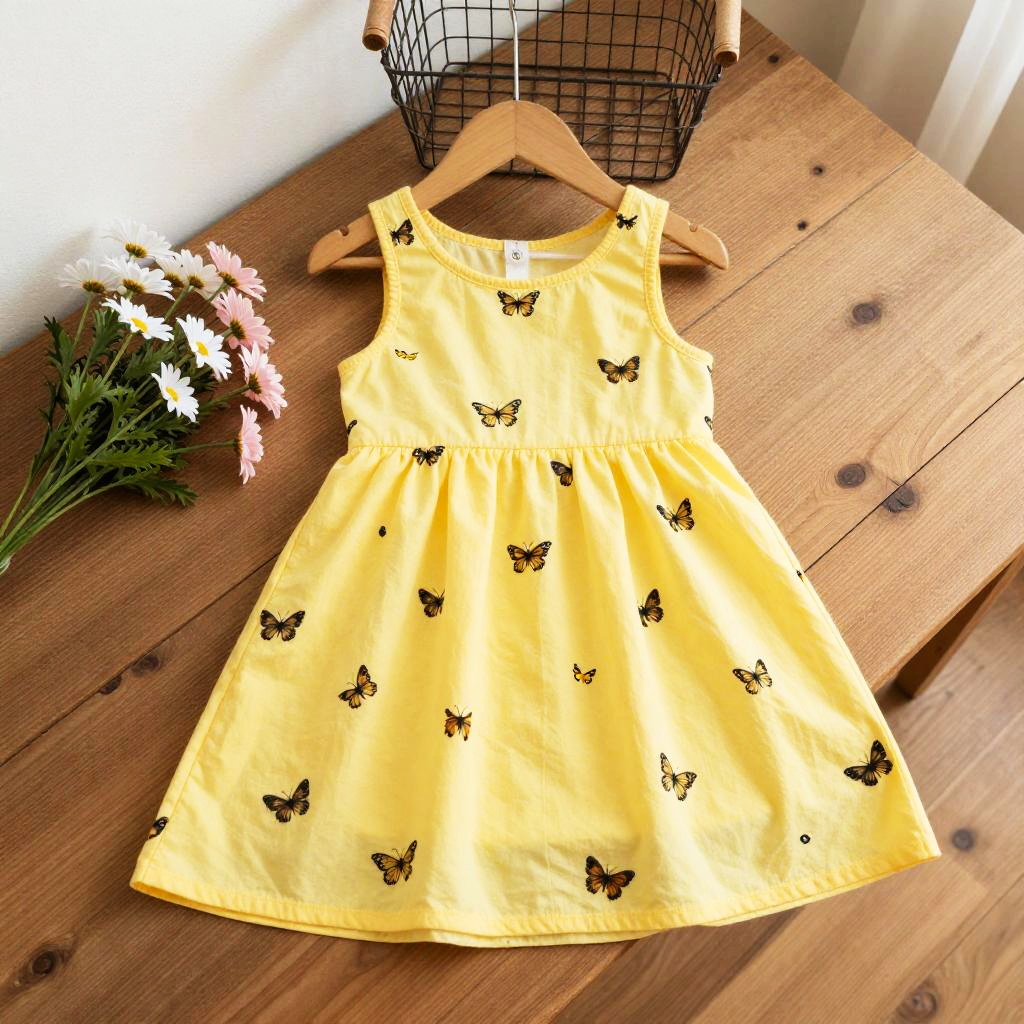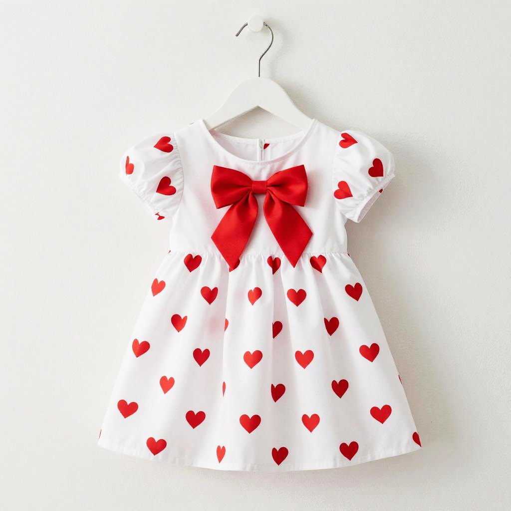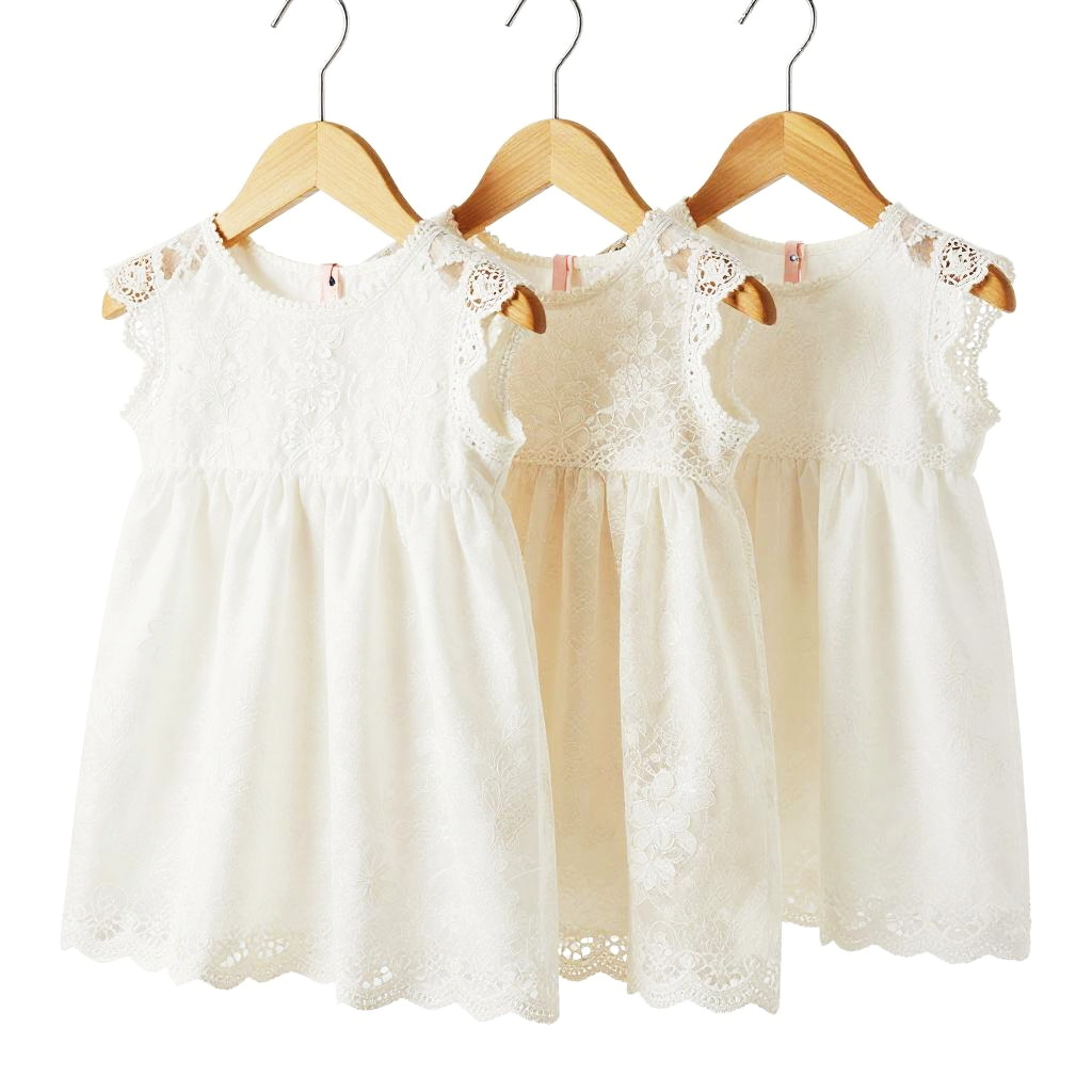 Photograph of three white, lace-trimmed children's dresses hanging on wooden hangers against a bright white background. Each dress has a floral pattern and delicate, airy fabric. The dresses are positioned slightly to the right, with the hangers spaced evenly. The image is well-lit, emphasizing the softness and detail of the lace and fabric textures.