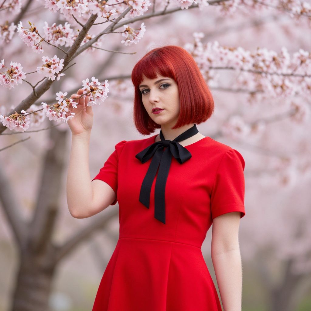 A young woman with vibrant red hair styled in a bob, wearing a red dress adorned with a black bow, stands gracefully amidst blooming cherry blossom branches. The contrast of her bold outfit against the soft pink flowers creates a striking and elegant visual, evoking a blend of modern fashion with nature’s delicate beauty.