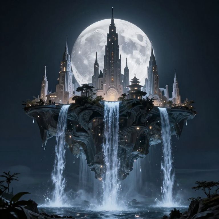 Sculpted moonlight drips from the spires of a floating city, illuminating inverted waterfalls that rise from the ground into the sky.