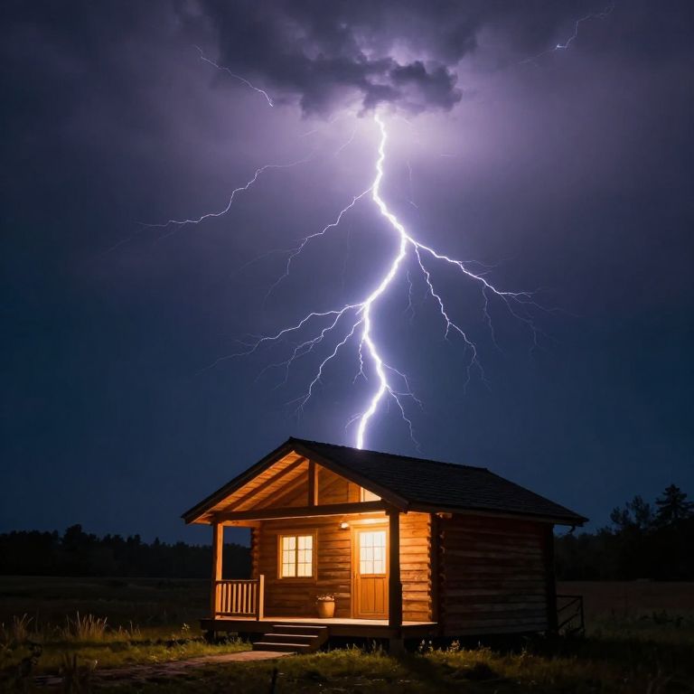 A luminous wooden cabin glows warmly against a night sky where a massive, branching bolt of lightning defies gravity by striking upwards, creating a surreal and otherworldly scene.