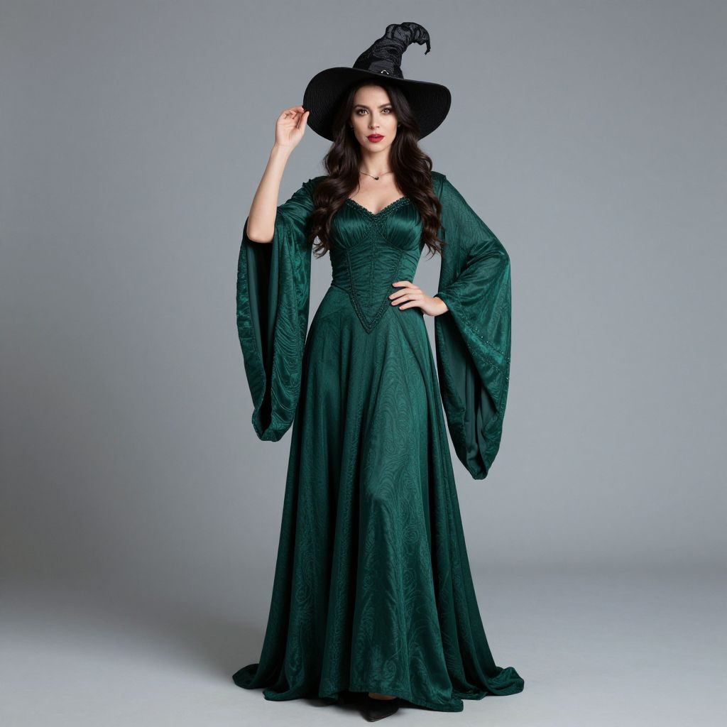 Sorceress Costume, woman in a green dress and a black hat