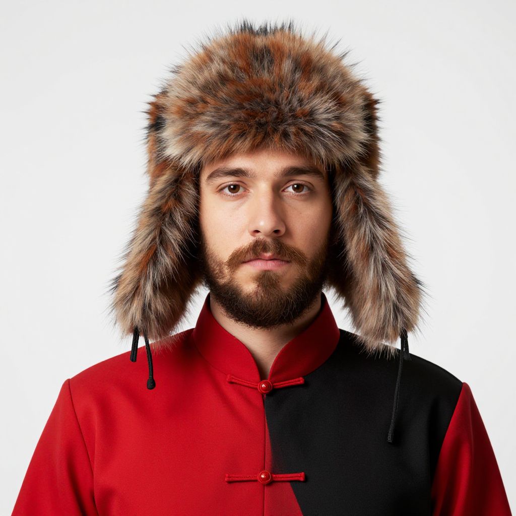 A man with a beard and mustache is wearing a red and black outfit with a furry hat.