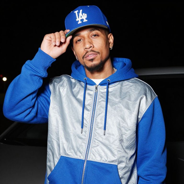 Rapper, wearing a blue and silver hoodie and a blue hat