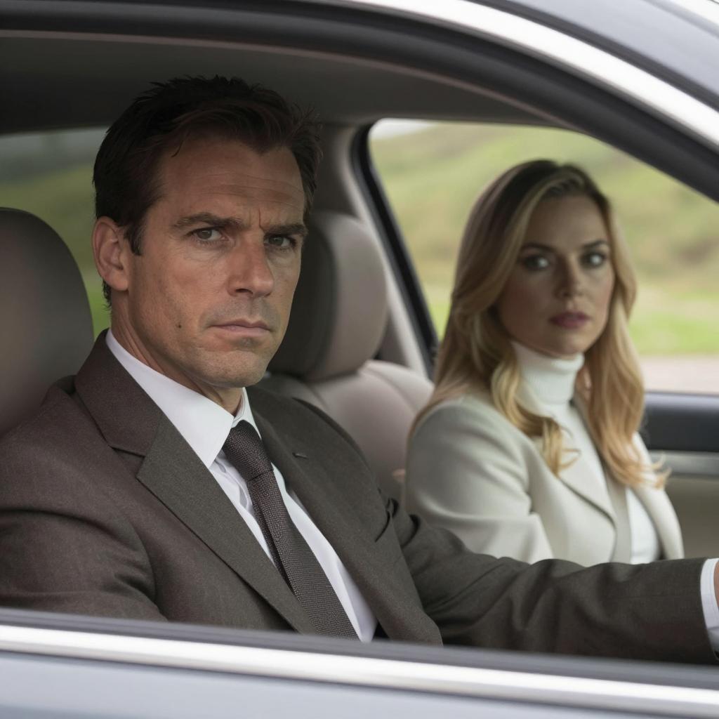 Two people in a snow-covered car. Driver, a white man with short brown hair, wearing a dark plaid shirt, grips the steering wheel. Passenger, a white woman with blonde hair, looks to the left. Car has a silver roof with a light bar. Snow and buildings in the background. Woman wears a brown jacket. Driver's left hand rests on the wheel. Driver's expression is focused.