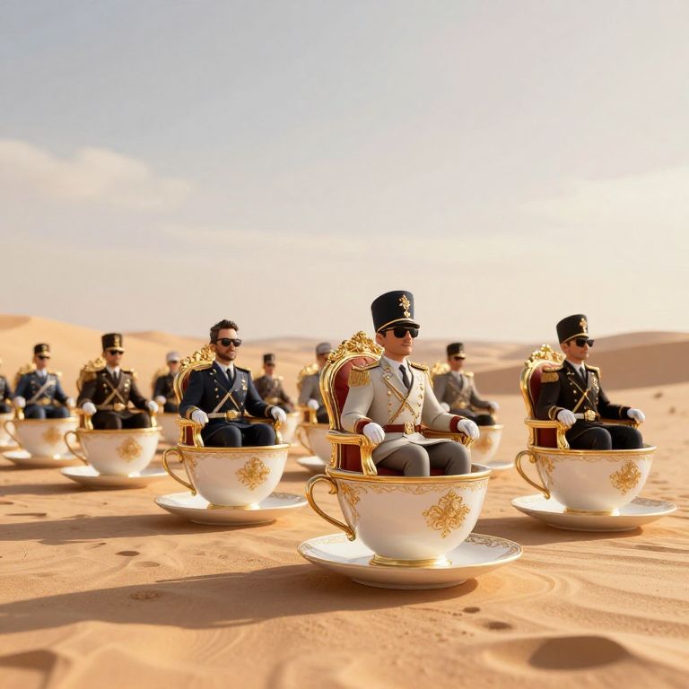 A whimsical 3D-rendered scene depicts an army of floating teacups adorned with intricate gold detailing, each serving as a throne for miniature generals dressed in formal attire and sunglasses, marching through a surreal desert landscape bathed in golden-hour lighting.