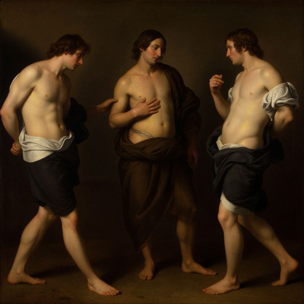 This digital painting in a Baroque style features three muscular, shirtless men with pale skin and dark, curly hair. They are dressed in loosely draped dark blue and brown cloths around their waists, exposing their toned torsos and legs. The man in the center, with a slightly darker complexion, has a black cloth draped over his shoulders and is gesturing with his right hand while his left hand rests on his chest. The man on the left is walking towards him with a white cloth around his waist, his right hand raised. The man on the right, also walking towards the center, has a white cloth partially covering his right shoulder and is looking at the center figure. The dark, shadowy background emphasizes their lit, muscular forms.