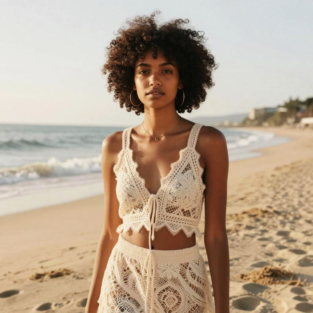 Drop Fade Afro hairstyle on man, wearing sporty windbreaker and leggings, in mountain overlook, captured in fashion editorial style with bright but soft daylight.