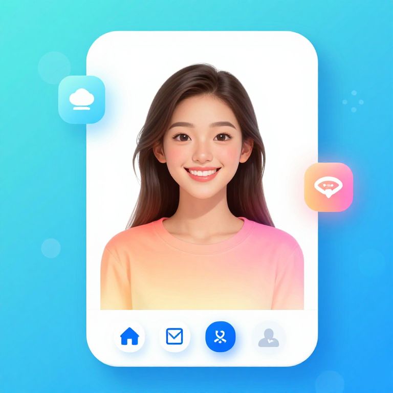 This digital image depicts a young Asian woman with long, dark brown hair, smiling warmly at the camera. She has fair skin and is wearing a light pink, long-sleeved top. Her photo is centered within a white, rounded rectangle against a bright blue background. The rectangle has a subtle glow effect and features icons at the bottom, including a house, camera, and star. Two translucent circular icons, one blue and one orange, appear near the top left and right corners, respectively. The overall style is clean and modern, with a focus on simplicity and clarity.