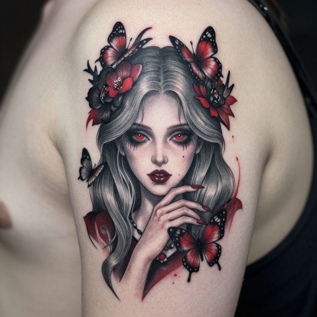 This is a photograph of a detailed tattoo on pale skin, featuring a gothic-style portrait of a pale woman with long, gray hair, red eyes, and red lips. She has a crown of black and red flowers with butterflies, and one hand rests near her mouth. The tattoo has a mix of black, red, and gray ink, creating a dramatic, eerie effect.