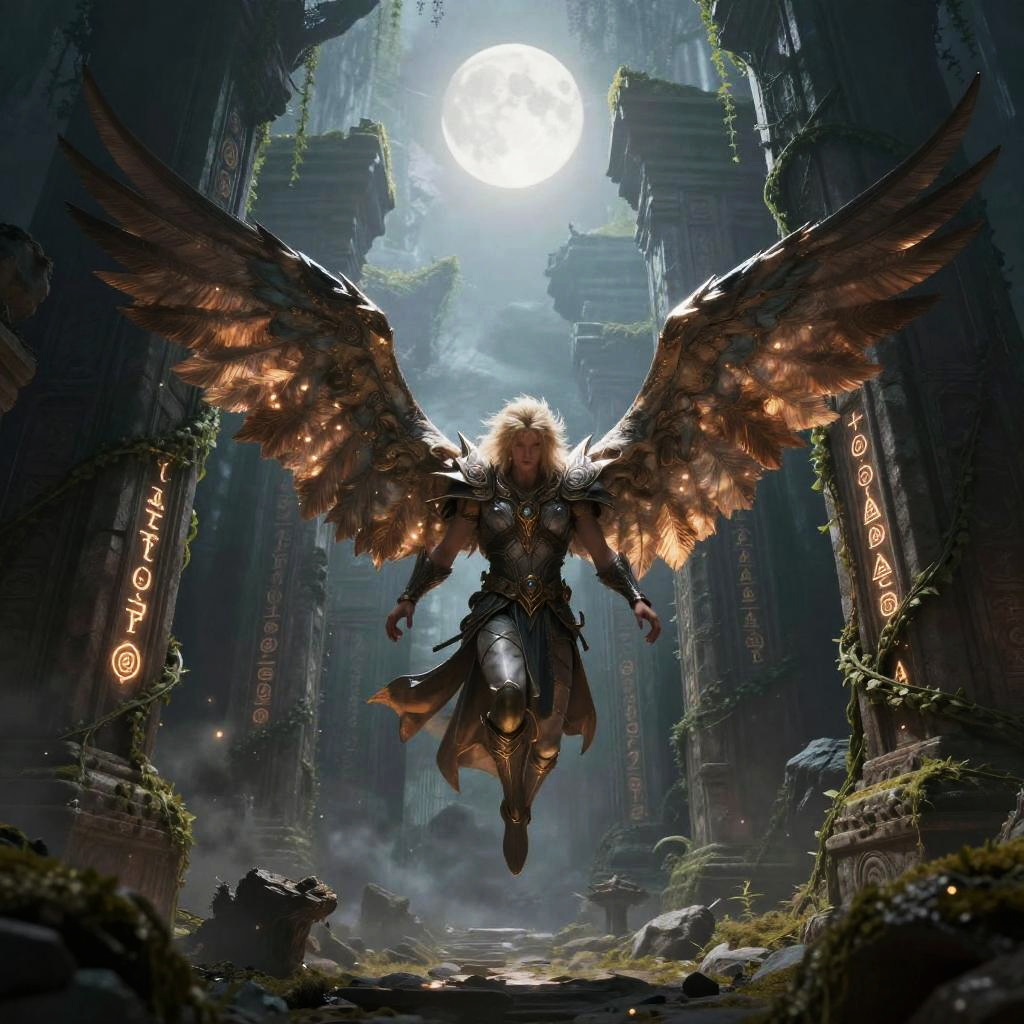 Falcor flying amid towering ancient ruins with vines and mystic runes glowing faintly, dappled moonlight illuminating his wings, a serene yet powerful presence, fantasy epic style with detailed textures and glowing effects