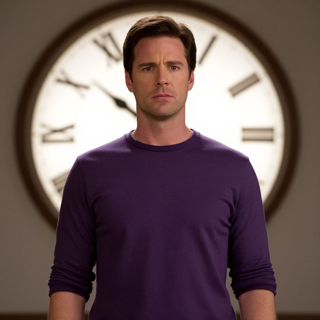 "Supernatural Show, man in a purple shirt standing in front of a clock"