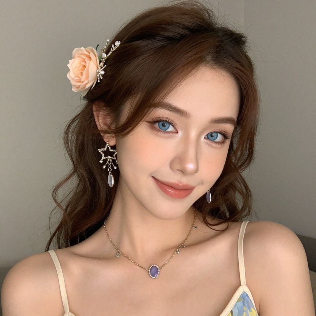 "english themed party costume, 1girl, solo, jewelry, flower, blue eyes, earrings, brown hair, looking at viewer, hair ornament, dress, necklace, smile, hair flower, realistic, upper body Realistic photo of casual sexy person with pretty face"