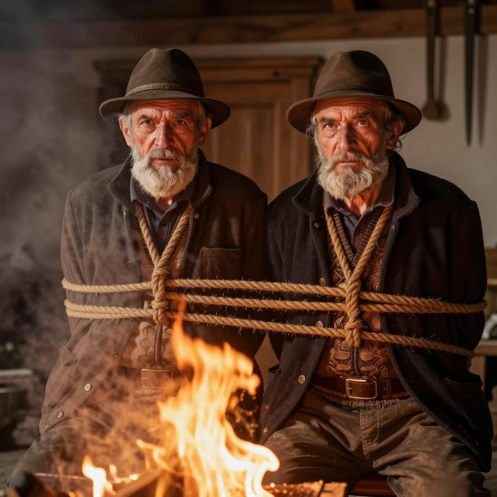 Two elderly men with gray beards, wearing brown hats and dark clothes, are bound together with rope at the chest. They stand in front of a large, intense fire. Both men have intense expressions. The background includes wooden furniture and hanging tools. The fire illuminates the scene with warm light.