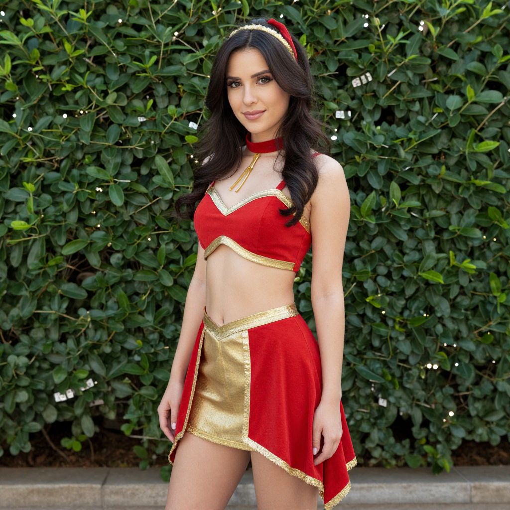 Photograph of a young woman with fair skin and long, wavy black hair, wearing a festive red and gold costume. Her outfit includes a red halter top with gold trim, revealing a toned midriff, and a matching red skirt with gold accents, ending mid-thigh. She accessorizes with a red headband. She stands in front of a lush, green hedge, with a stone wall partially visible at the bottom. Her expression is confident and she has a slight smile. The bright colors of her costume contrast with the green background, making her stand out prominently in the image.