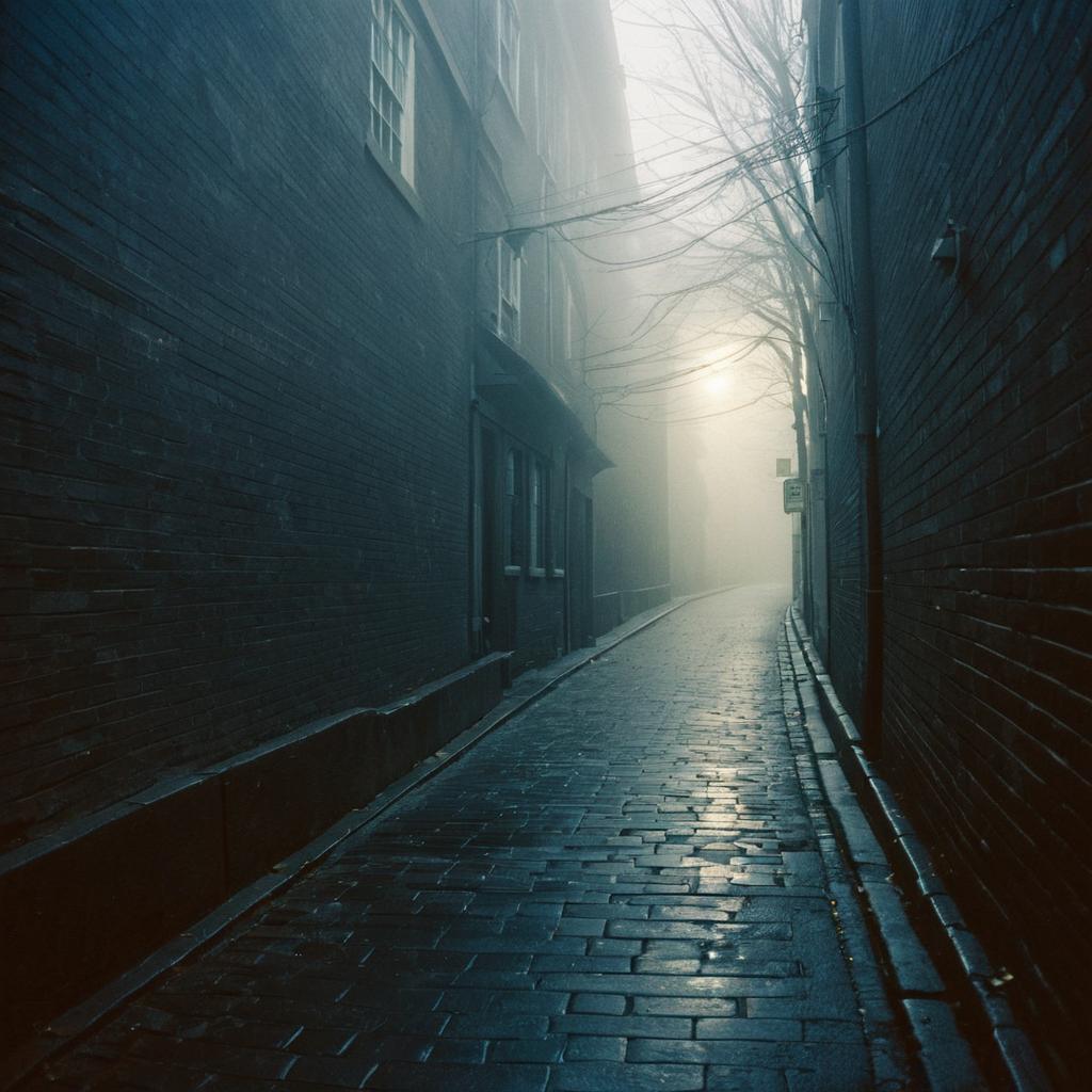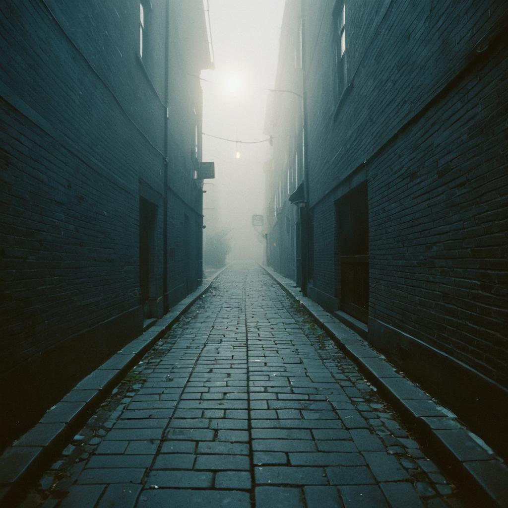 Still photograph of a foggy early morning alley, capturing a sense of isolation, mystery. The passive camera shot uses a wide-angle lens and slow shutter speed to emphasize the moment, featuring refracted lens flare and subtle post-processing techniques.