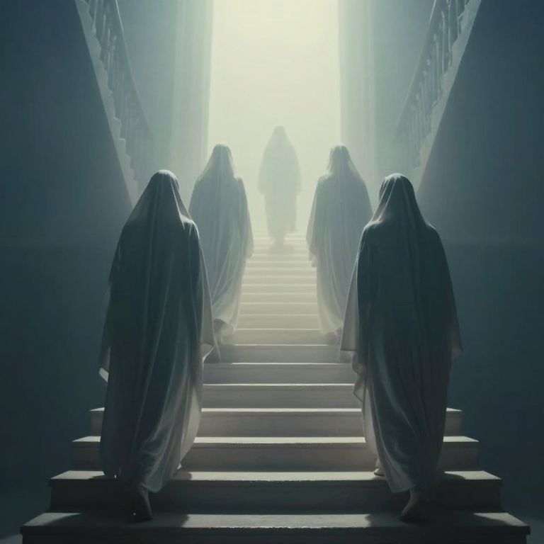 In the hushed corridors of decay, spectral figures cloaked in white whisper forgotten stories through the drifting mist, their presence a haunting echo of loss and longing, while the crumbling walls bear witness to the transient weight of memory and the silent passage of time.
