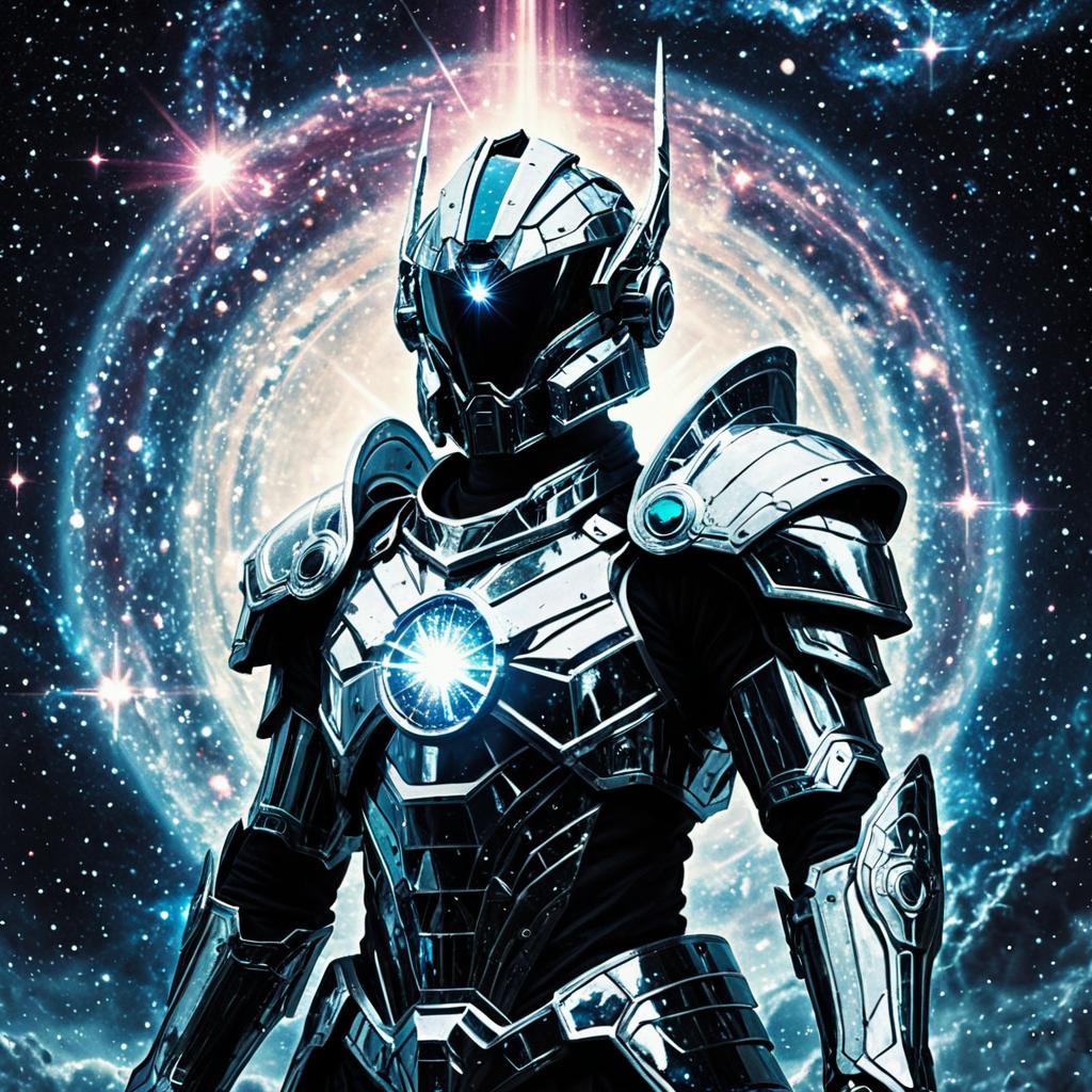 Digital artwork of an ancient celestial guardian wearing fragmented stardust armor with glowing cosmic blue eyes. The figure stands against a backdrop of a vast galactic nebula filled with stars and cosmic light, embodying a haunting and enigmatic sci-fi fantasy style. The armor features intricate metallic plating adorned with cosmic spheres, emphasizing a celestial theme.