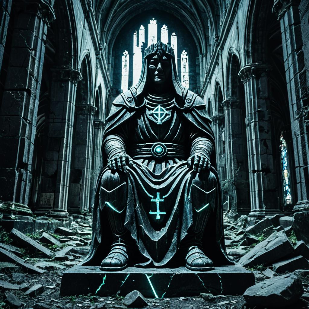 An ancient celestial guardian, with fragmented stardust armor and glowing cosmic eyes, looming in an endless galactic nebula, depicted in the haunting and enigmatic style of Hideaki Anno.