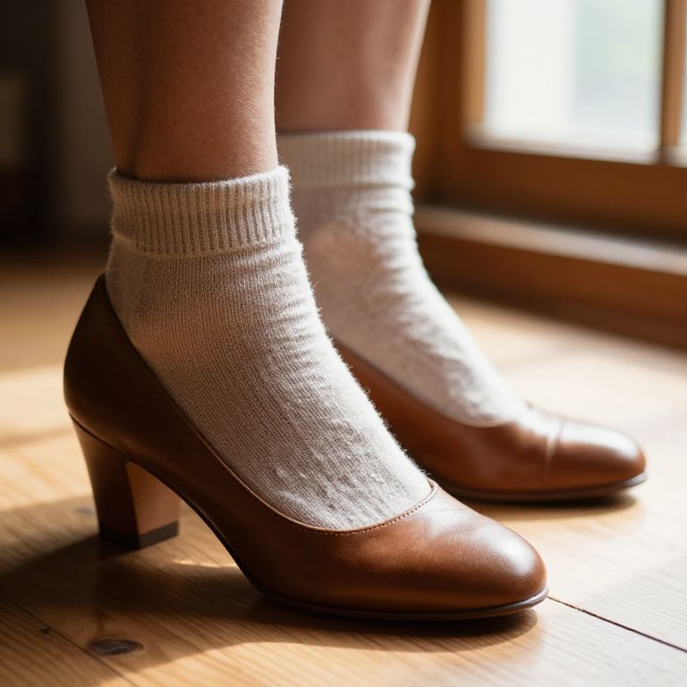 Close-up of granny heels on aged feet, classic knitted socks, wooden floor, soft sunlight streaming through rustic window, warm tones, detailed leather and fabric