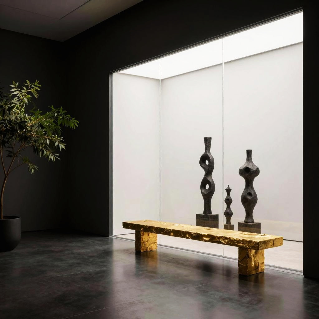 Photograph of a modern art gallery. The image features a sleek, dark room with a large illuminated glass wall on the right, casting bright light. In front of the wall is a textured, golden bench with several tall, dark, abstract sculptures. To the left, there's a bush with green leaves. The floor is dark and reflective, adding a contemporary feel.